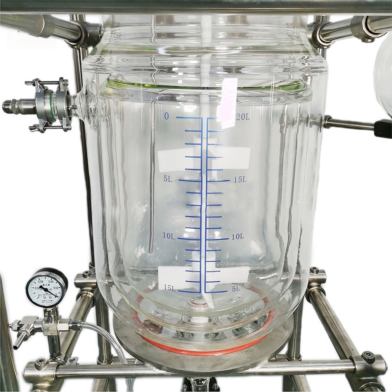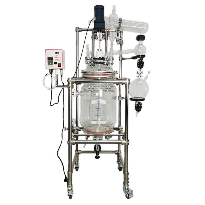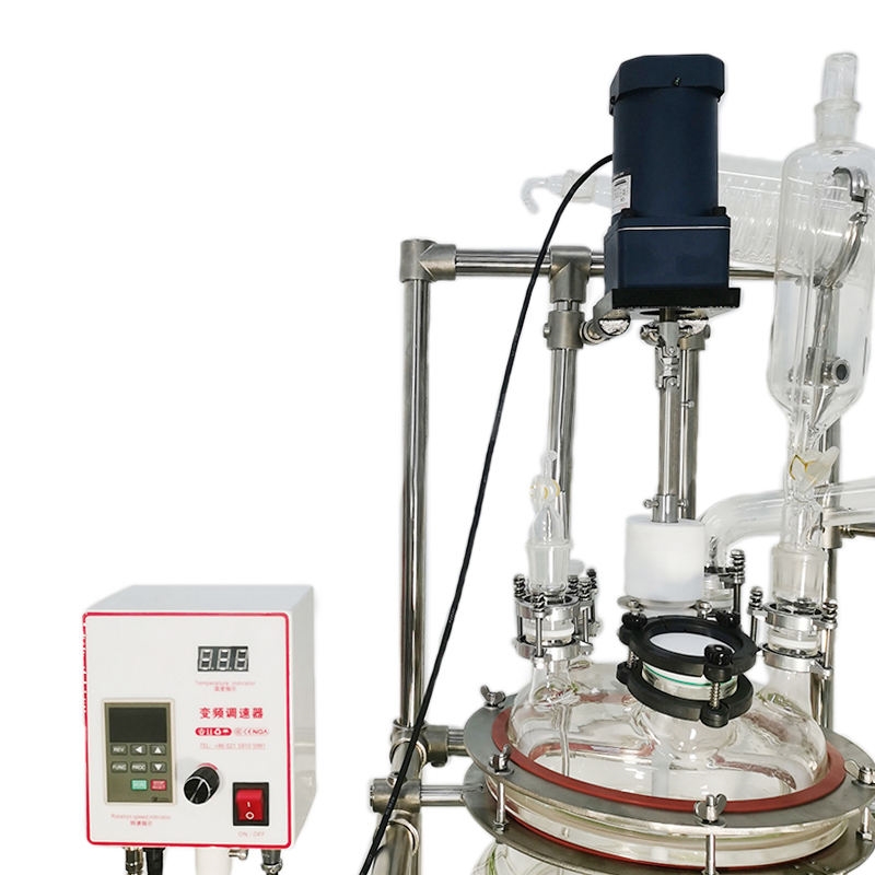 The body of the three-layer glass reactor is composed of two sets of interlayers composed of three layers of glass, which can provide a stirring function and control the evaporation and reflux of the reaction solution. The inner jacket of the three-layer glass reactor is used for heating or cooling. The outer jacket is used for vacuuming, and the refrigerating or heating temperature of the materials in the kettle can be maintained as much as possible under the vacuum state of the outer interlayer. The materials are reacted in the reaction kettle, and after the reaction, the materials are discharged from the PTFE outlet at the bottom of the kettle.