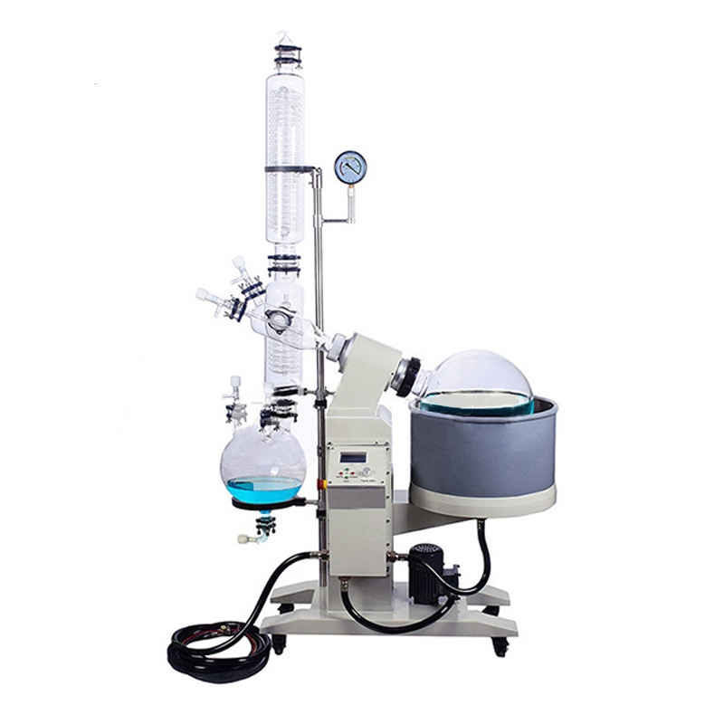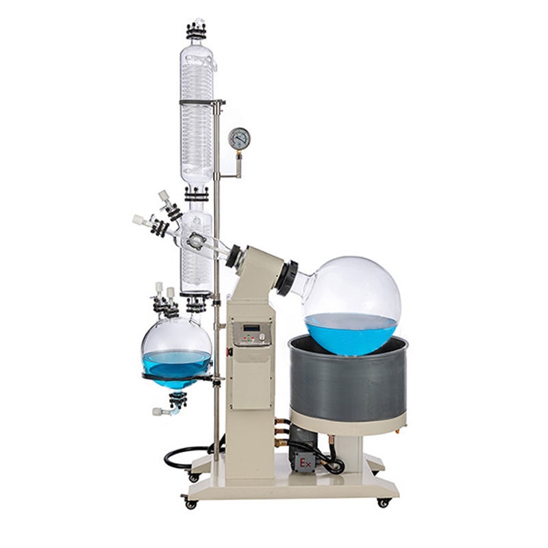 The explosion-proof rotary evaporator is mainly used for concentration, crystallization, drying, separation and solvent recovery in the pharmaceutical, chemical and biopharmaceutical industries. The principle is to heat the rotating bottle at a constant speed under vacuum conditions, and the material forms a large-area film on the bottle wall, which evaporates efficiently. The solvent vapor is cooled by a high-efficiency glass condenser and recovered in the collection bottle, which greatly improves the evaporation efficiency. It is especially suitable for the concentration and purification of biological products that are easily decomposed and denatured at high temperature.
