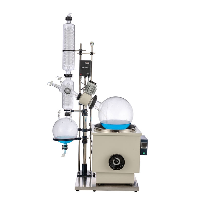 Rotary evaporator is the use of stepless speed control glass rotating bottle constant speed rotation, the material in the bottle wall to form a large area uniform film, and then by the intelligent constant temperature water bath on the rotating bottle of uniform heating, vacuum conditions, high-speed evaporation, Efficient glass condenser cooling, recovery in the collection bottle.