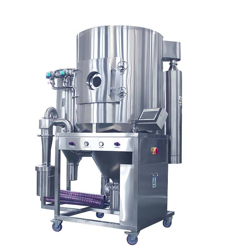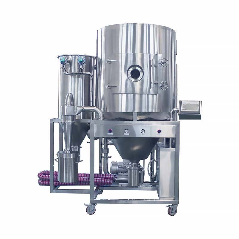 2. The atomization system adopts centrifugal atomizer. The pump sends the material and liquid into the atomizer, and the high-speed airflow ejected from the annular gap of the nozzle atomizes the material and liquid, and the particle size of the droplet can be adjusted by changing the gas-liquid ratio.
