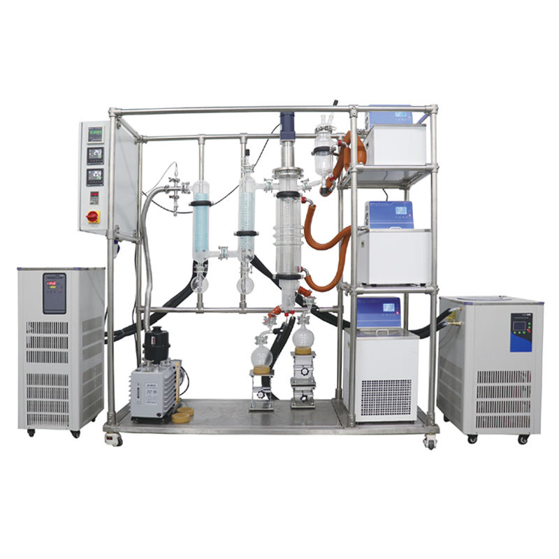 Molecular distillation is a special liquid-liquid separation equipment. Unlike traditional distillation, it relies on the boiling point difference separation principle, but on the difference of the average free path of different substances. When the liquid mixture flows along the inner wall of the main evaporator and is heated, light and heavy molecules will escape from the liquid level and enter the gas phase. Due to the different free paths of light and heavy molecules, the molecules of different substances move different distances after escaping from the liquid level. After passing through the built-in condensate pipe of the main evaporator, the light molecules reach the condensate pipe and are discharged, while the heavy molecules cannot reach the condensate pipe and are discharged along the mixed liquid, So as to achieve the purpose of material separation.