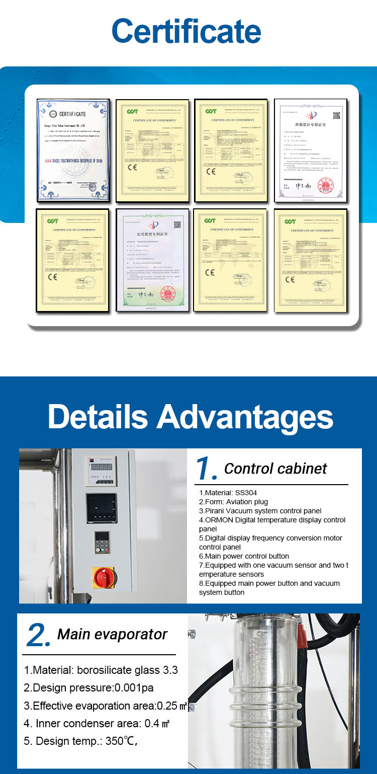 The materials are transported from the feed tank to the jacketed main evaporator. The main evaporator is continuously heated. The built-in scraper evenly scrapes the materials into a layer of flowing liquid film for instant evaporation. The light component materials begin to vaporize and adsorb on the built-in condensing coil, flow into the receiving bottle along the outer wall of the condensing pipe, and the heavy component materials flow into the receiving bottle along the inner wall of the main evaporator.