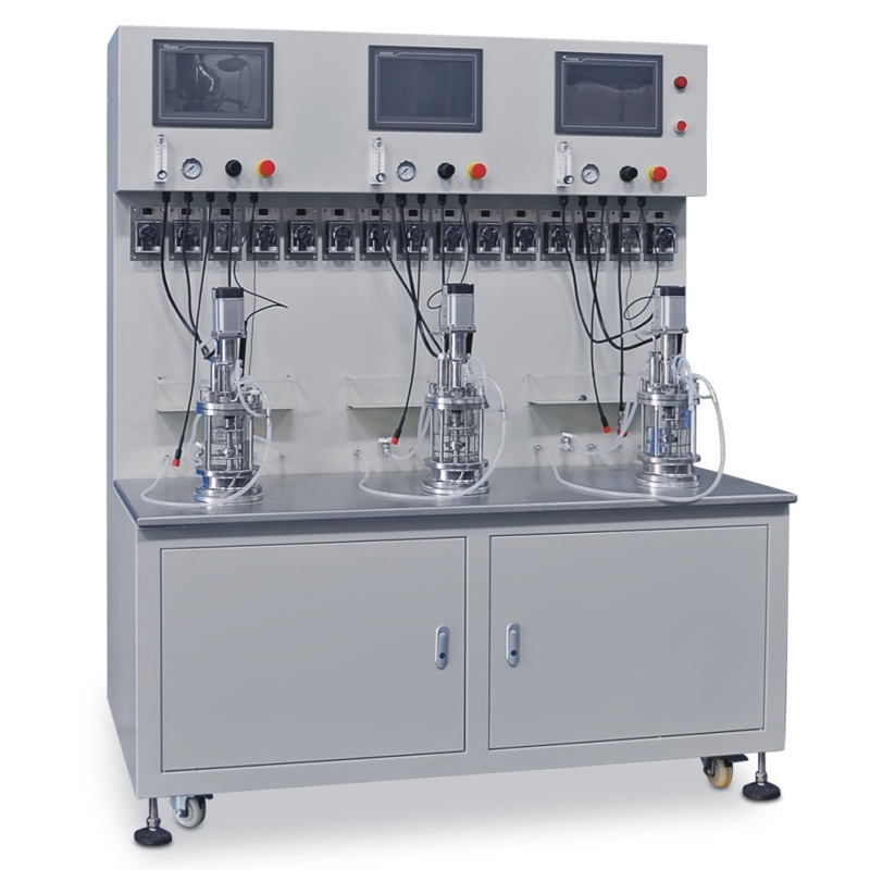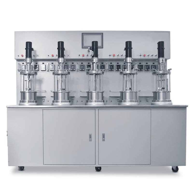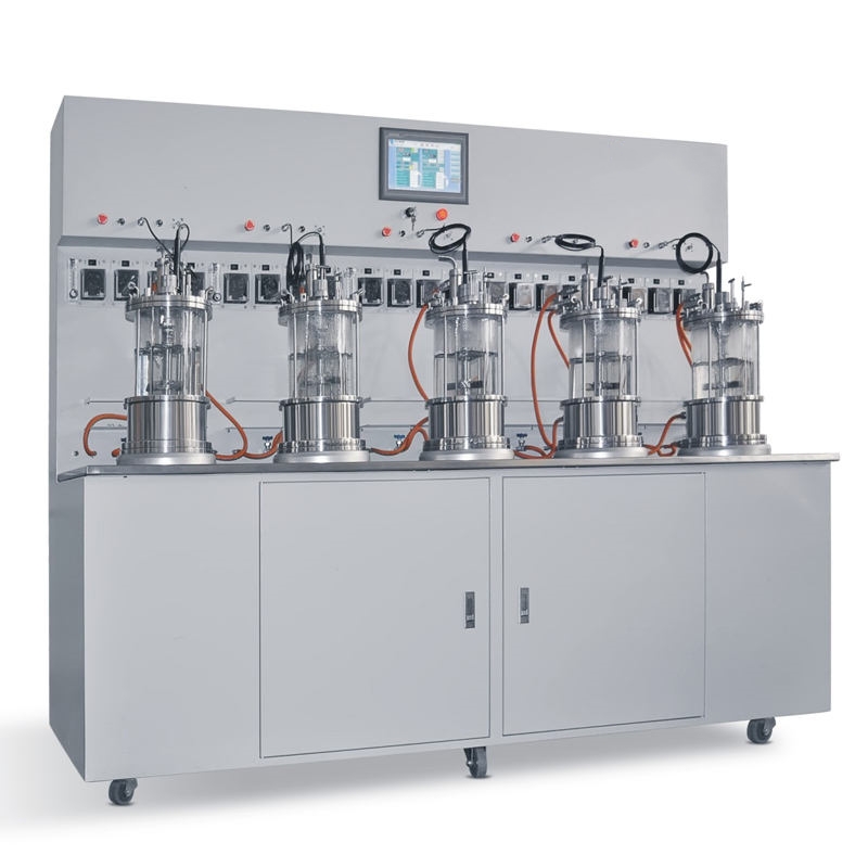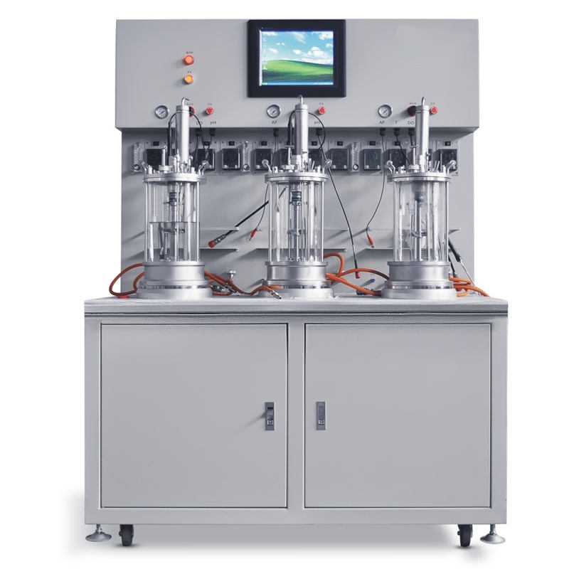 Four conjoined glass bioreactor is a set of laboratory glass fermentation equipment, easy to operate, powerful, and can meet various purposes of fermentation, such as batch, batch feeding, and even animal cell culture. The color touch screen is used to display all measured values and control parameters, which greatly facilitates the user’s operation. Each tank is equipped with 4 peristaltic pumps beside the front tank, which can supply acid, alkali, defoamer and culture medium to the fermentation tank. Various parameters in fermentation such as pH, DO, temperature and speed can be monitored by the controller, and all data and control parameters can be transmitted to the controller or computer. The structure is compact, and various components can be integrated into the fermentation system. It adopts the direct coupling mechanical stirring method driven by the upper part or the magnetic indirect coupling mechanical stirring method driven by the lower part, which has a simple structure and stable operation.