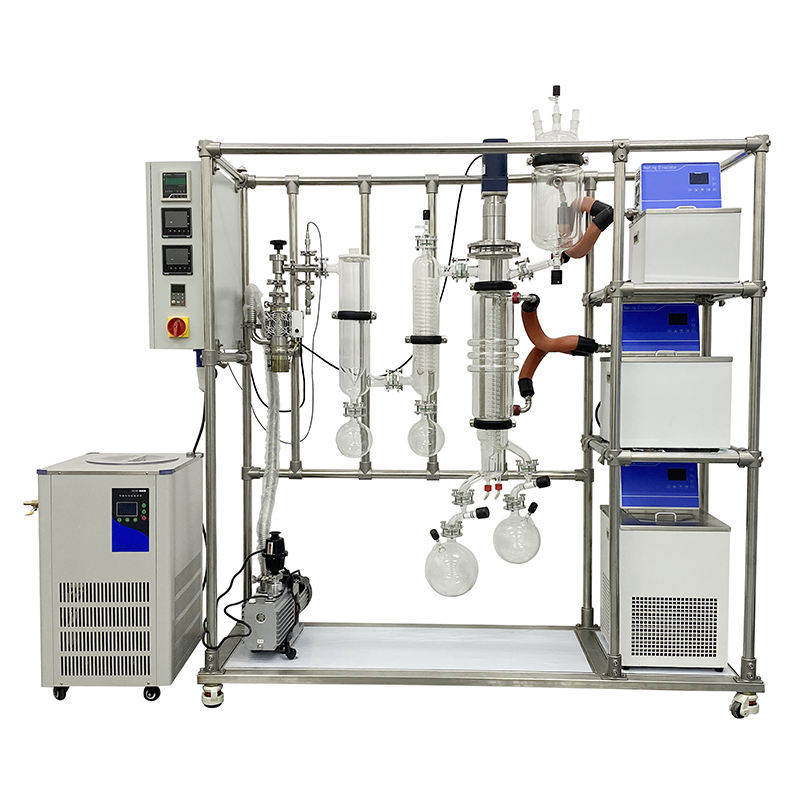 Molecular distillation is a special liquid-liquid separation equipment. Unlike traditional distillation, it relies on the boiling point difference separation principle, but on the difference of the average free path of different substances. When the liquid mixture flows along the inner wall of the main evaporator and is heated, light and heavy molecules will escape from the liquid level and enter the gas phase. Due to the different free paths of light and heavy molecules, the molecules of different substances move different distances after escaping from the liquid level. After passing through the built-in condensate pipe of the main evaporator, the light molecules reach the condensate pipe and are discharged, while the heavy molecules cannot reach the condensate pipe and are discharged along the mixed liquid, So as to achieve the purpose of material separation.