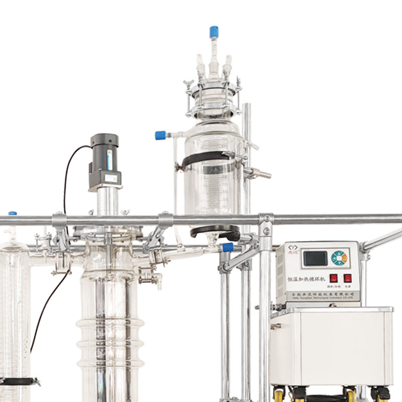 The materials are transported from the feed tank to the jacketed main evaporator. The main evaporator is continuously heated. The built-in scraper evenly scrapes the materials into a layer of flowing liquid film for instant evaporation. The light component materials begin to vaporize and adsorb on the built-in condensing coil, flow into the receiving bottle along the outer wall of the condensing pipe, and the heavy component materials flow into the receiving bottle along the inner wall of the main evaporator.