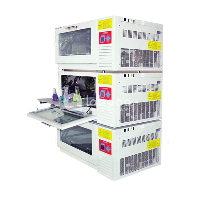 With refrigeration stackable constant temperature oscillator, it can be used alone or three stacked on top of each other, and only one floor of the stacked constant temperature oscillator is needed. Three-axis eccentric balance movement, stable and reliable, long service life. The speed control system has a speed terminal feedback system to keep the machine oscillating with high precision.