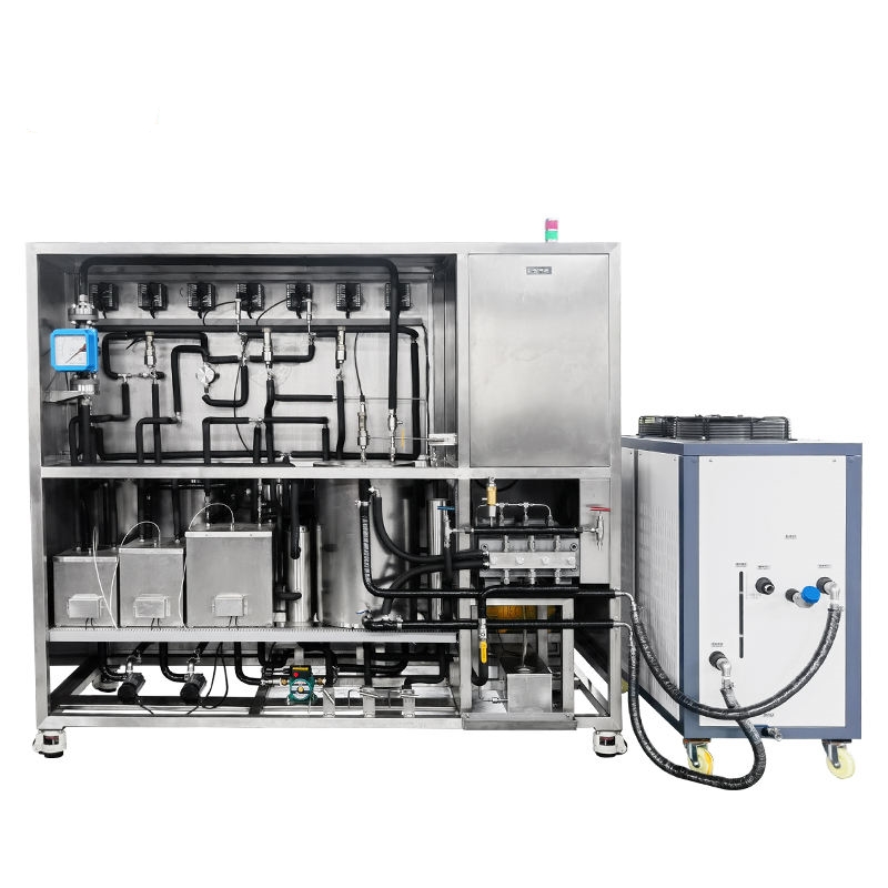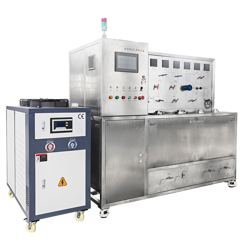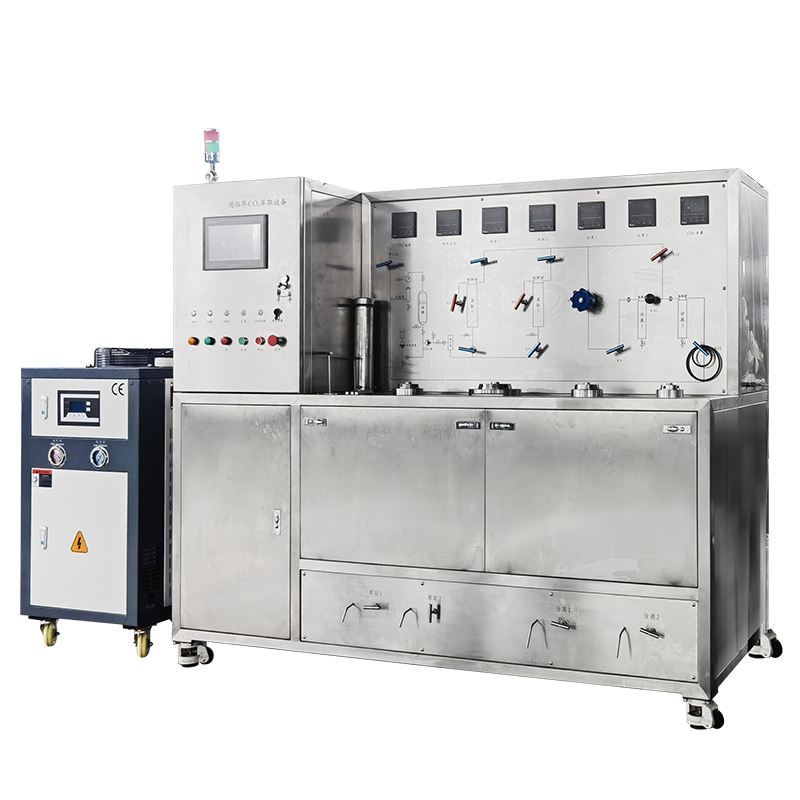 The supercritical CO2 device mainly consists of an extraction kettle, a separation kettle, a CO2 high-pressure pump, an entrainer pump, a refrigeration system, a CO2 storage tank, a heat exchange system, a purification system, a flow meter, a temperature control system, a pressure control measurement system, and a touch screen PLC. It is composed of control acquisition system, safety protection device, etc.
