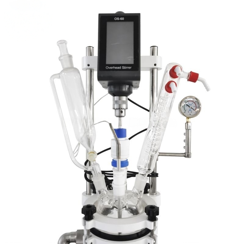 This small glass reactor has touch screen control and is very suitable for laboratory desktop chemical reactions or placed in a fume hood for experimental operations. The lifting height and reactor body size can be customized.